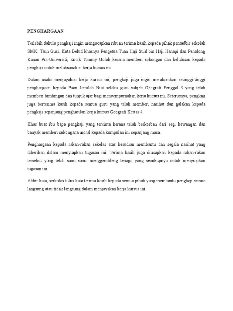 Penghargaan Kerja Lapangan Geografi / Siri 2 Tips Mudah Kerja Lapangan Geografi Penghargaan Pendahuluan Objektif Kajian Youtube Cuitan Dokter. Kerana beliau telah memberi kebenaran kepada saya untuk menjalankan kerja kursus ini. Bboorraanngg ssooaall sseelliiddiikk kerja kursus geografi pmr 2011 sekolah . Berikut adalah format asas yang perlu ada dalam penulisan laporan kerja kursus /kajian lapangan geografi pt3 (klgt3):. Kerja kursus geografi pt3 2018, contoh jawapan beserta panduan cara buat folio tugasan pengenalan, kerangka isi kandungan, rumusan. Selain itu, kepada guru mata pelajaran geografi saya . Kerja kursus geografi stpm 2015. Contoh objektif kajian kerja lapangan tugasan geografi tingkatan 3 bumi gemilang.